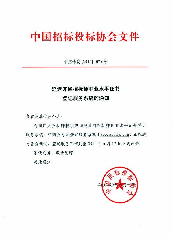 延迟开通招标师职业水平证书登记服务系统的通知